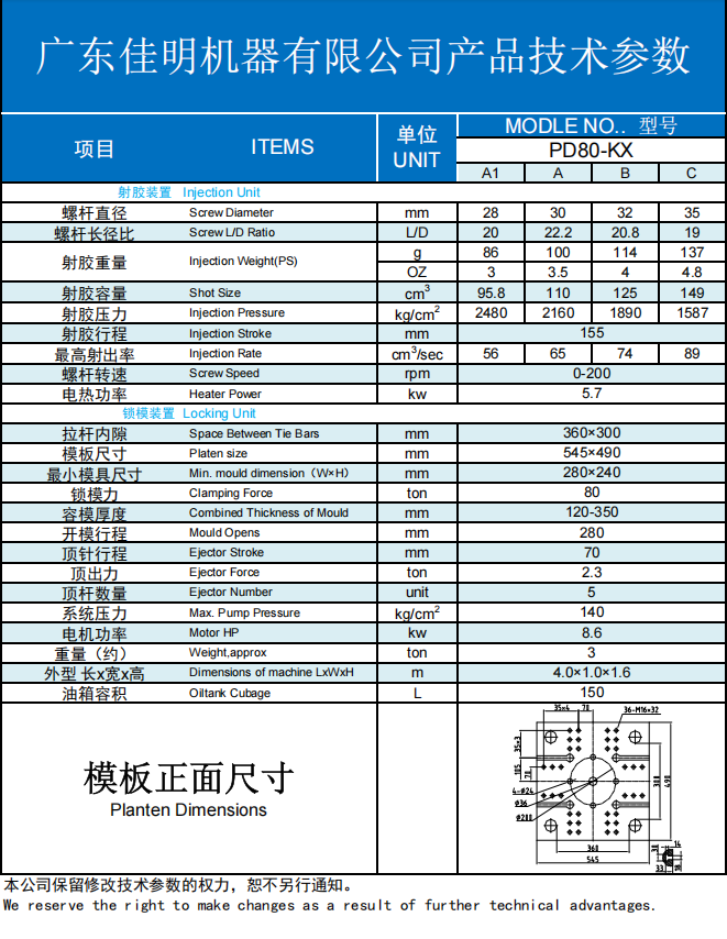 控制系统 >>采用名厂先进电脑控制 >>自我诊断故障功能 >>直接输入压力,速度,时间,行程,温度等数据 >>LCD彩色液晶显示器 >>集中润滑 >>压力耦合油路节省电力 >>24V直流油压方向阀,线圈永不烧毁 >>模具冷却水调节装置 >>先进电脑控制系统,大屏幕显示,操作界面化,简洁易用 >>高精度电子尺行程控制,精确度可达到?0.1mm >>机械,电气,油压三重安全装置,任何情况可保证操作人安全(PD60-168选配油压安全) >>通过安装优越的位置传感器来提高再现性及操作性 >>利用闭环控制来实现超精密成型 |